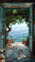 Dit vrije, trendy kunstwerk toont een prachtige doorgang vanuit een rustieke kamer naar een adembenemend zeegezicht.