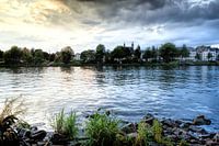 Vanaf de oever aan De Maas, nabij de Hoge Brug met zicht op De Helpoort: Vesting Museum Maastricht. Vlak voor zonsondergang hebben de wolken links in de afbeelding een warme kleur (geel) en aan de rechterkant een koele (blauwe) kleur.