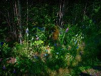 Bloeiende wilde planten aan de rand van het bos in licht en schaduw in de regio Kalmar län, Zuid-Zweden