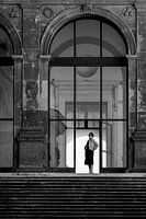 Het hele frame voelt als een podium. Een scherpe, elegante vrouw staat in het midden, geposeerd in de gloed van een gewelfde ingang die bijna een spotlight lijkt. De symmetrie is hier onmogelijk te missen - de treden leiden je blik omhoog, waarna de verticale lijnen van de stenen gevel je recht in het glas trekken, waar alles als een…