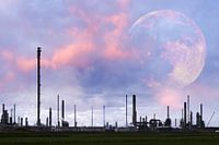 Het silhouet van een raffinaderij met een dreigende lucht en een grote volle maan.