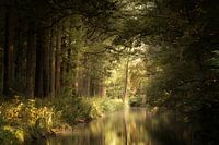 De zon licht schijnt zacht op dit kasteelmeer tijdens het gouden uur in een Nederlands bos