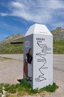 Dit is een foto van een opvallende, zeshoekige paal die informatie geeft over de klim van de **Angliru** in Spanje, een van de zwaarste beklimmingen in het professionele wielrennen. De paal is gemaakt van beton en heeft een routekaart met de verschillende secties van de klim, van La Vega de Riosa (327m) tot de top van Angliru (1570m), inclusief de steilste stukken zoals **Les Cabanes** (22%).