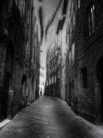 Een oudere vrouw loopt alleen door een van de vele smalle steegjes in het oude centrum van Volterra. Straatfotografie uit Italië in zwart-wit.