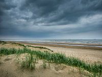 Het Noordzeestrand bij Katwijk, met wolken die het binnenland intrekken. Op de voorgrond de duinen, begroeid met helmgras.