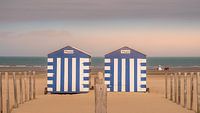 Mobiele strandhuisjes op het strand van de Panne in België. De huisjes worden gebruikt om persoonlijke spullen in op te slaan maar ook als kar om frisdrank of snacks te verkopen.
