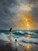 Dit prachtige schilderij toont een intiem moment tussen moeder en kind, wandelend hand in hand langs het strand bij zonsondergang. De lucht is gevuld met warme tinten, terwijl het licht van de ondergaande zon door de woeste golven breekt, wat een magisch effect van licht en schaduw creëert. De lichte penseelstreken en zachte kleurvariaties geven het werk een impressionistische stijl, met veel aandacht voor sfeer en emotie.