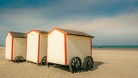 Mobiele strandhuisjes op het strand van de Panne in België. De huisjes worden gebruikt om persoonlijke spullen in op te slaan maar ook als kar om frisdrank of snacks te verkopen.