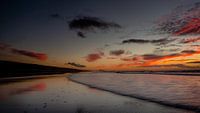 De golven komen langzaam aan gerold op een mooie herfst avond. Als het water zich weer terugtrekt blijft een prachtig gekleurde spiegel over.