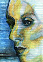Geschilderd geabstraheerd portret. Gezicht van de zijkant gezien. In de achtergrond en door haar gezicht heen zijn blauwe lijnen geschilderd. Het suggereert dat ze zich aan zee bevindt. De warme gele kleuren geven het zonlicht weer.