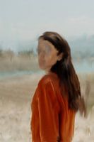 Abstract portret met de titel: "aan zee". Donkerharige vrouw in oranje jas met bruin/blauwe achtergrond.