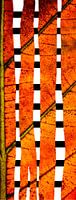 Abstracte kunst met een foto van een intens gekleurd herfstblad met duidelijke nerven en zwart wit lijnen er tussen. Het schreeuwt om aandacht.