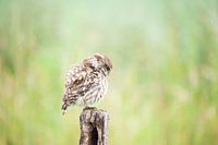 De achtergrond is mooi zacht waardoor het uiltje er mooi uitkomt.