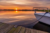 Mooie landschapsfoto van een zonsopgang boven een meer. Op de voorgrond een afgemeerde boot op een houten steiger. De lucht kleurt oranje, paars en roze en zowel de kleurrijke lucht als de zon reflecteren in het water. Deze foto geeft je echt een zomerse vakantie- en kampeergevoel. Bij Blokzijl, nationaalpark de Weerribben, in Overijssel, Nederland.