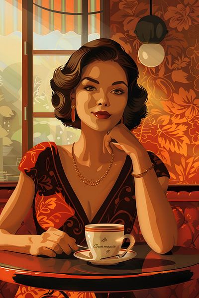 Een elegante Art Deco reclameposter toont een verleidelijke vrouw die in een Frans café zit en de kijker met een charmante glimlach aankijkt. Voor haar staat een kopje koffie, wat het plezier en de elegantie van het tafereel benadrukt. De combinatie van de glamoureuze Art Deco stijl en het sensuele charisma van de vrouw nodigt de kijker…