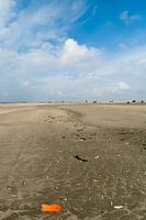 Lopen op het strand van het wad, zie je altijd weleens oranje handschoen liggen. Bijna nooit een andere kleur, deze is genomen met een helder blauwe lucht aan de rand van het werelderfgoed het Wad.