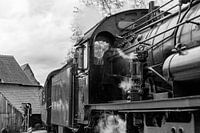Een historische stoomlocomotief die een oud station van het dorp binnenrijdt
