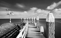 Een lange belichting tijdens daglicht met houten bolders en een aanlegsteiger bij de kade van de jachthaven op oostelijk Vlieland.
