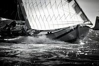 IFKS Skûtsje wedstrijd op het Ijsselmeer. Skûtsje helt zwaar over naar stuurboord waarbij bemanning gedeeltelijk in het water staan. Zwart Wit Foto.