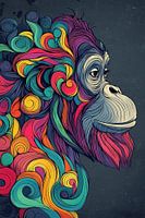 Aap Met Kleurrijke Haar Stijl - Op dit schilderij zie je een kleurrijke aap met een bont en artistiek haarstijl, in een moderne graffiti stijl, die helemaal vol zit met spiralen en felle kleuren.