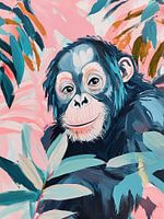 Aap | Zomer Aap Tussen de Bladeren - Op dit schilderij zie je een vrolijke aap met een scherpe blik, omringd door kleurrijke bladeren in een zachte roze achtergrond, waardoor dit een speels en levendig zomerschilderij maakt.