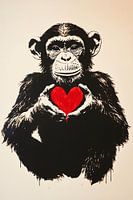 Dit unieke ontwerp combineert een speelse afbeelding van een aap met een krachtig symbool van liefde. Het rode hart dat de aap in zijn handen vormt, springt direct in het oog en contrasteert prachtig met de zwarte en witte stijl van de rest van het beeld. Dit kunstwerk straalt warmte, humor en een subtiele boodschap van verbondenheid uit, perfect om een ruimte een eigenzinnige, maar stijlvolle touch te geven. Ideaal voor liefhebbers van moderne kunst of street art, en geschikt voor zowel thuis als op kantoor.