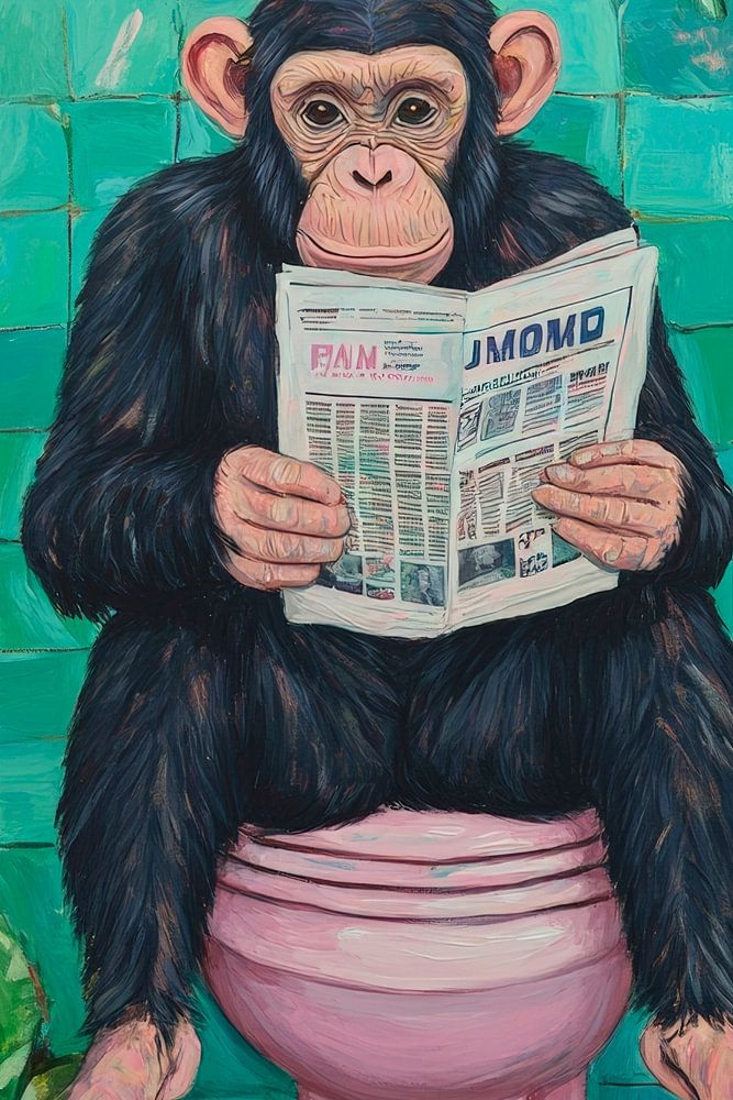 In een charmante badkamer met vrolijke planten woont een levendige aap in een grappige pose. Met een krant in zijn hand straalt hij een ontspannen gevoel voor humor uit. De levendige kleuren en het verrassende tafereel geven de kamer een vrolijke sfeer en maken het een perfecte blikvanger voor gasten en familieleden.