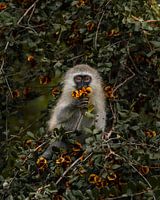 Soms vang je precies het juiste moment – zoals deze nieuwsgierige aap midden in het Krugerpark, die even pauzeert tussen de bladeren met een oranje bloem in z’n hand. Alsof hij eraan ruikt, of zich gewoon afvraagt of het eetbaar is. Ik zat verstopt met m’n 400mm lens, in alle stilte, en dit moment voelde alsof ik even werd toegelaten tot zijn wereld.