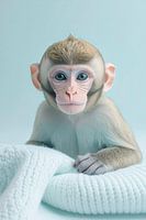Een schattig babyaapje, met een roze snuit en grote roze oren, zit op een grof gebreid blauw kleed. De achtergrond is ook blauw, net als de ogen van het aapje. Het beeld is met behulp van ai gegenereerd.