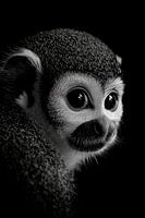 Een fascinerend portret van een schattig aapje met grote, nieuwsgierige ogen en een pluizig, opvallend gezicht. De contrastrijke zwart-witafbeelding geeft het beestje een indrukwekkende diepte. Ideaal voor een woonkamer of creatieve studio, het creëert een speelse sfeer en zorgt voor een glimlach.