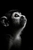 Een fascinerende blik in de wereld van een kleine primaat die met glanzende ogen in de duisternis staart. Zijn uitdrukking combineert nieuwsgierigheid en vastberadenheid, terwijl het spel van licht en schaduw een dramatische sfeer creëert. Perfect voor in de woonkamer om een gesprek op gang te brengen en de zintuigen te prikkelen.
