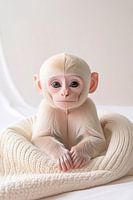 Een schattig klein aapje, met grote roze oren en een lief roze snuitje. Het is gewikkeld in een grof gebreide roze wollen deken en ook de achtergrond is roze. Het is een lief zacht aapje. Het beeld is met behulp van ai gegenereerd.