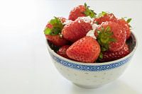 Aarbeien traktatie. Verse aarbeien met poedersuiker in een kommetje. Een toetje of een voorgerecht.