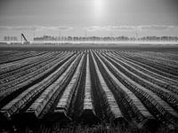 dit zijn de repen aarden die voor de aardappelen zijn gemaakt. foto geschoten in de vroege morgen, waar de mist nog op de grond hangt in de verte.
