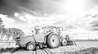 Grote moderne tractor aardappelen rooien in het veld op een zonnige lentedag