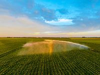 Aardappelplanten groeien in een veld met bloeiende groene planten tijdens zonsondergang van bovenaf gezien. Een irrigatiepistool sproeit water op de planten.