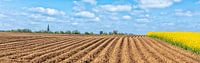 Panorama van een akker met aardappelruggen en koolzaad in de buurt van Vijlen in Zuid-Limburg