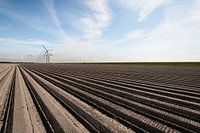 Nederlands landschap met convergerende aardappelruggen in strakke lijnen. Op de achtergrond staan windturbines.