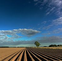 Aardappelruggen in het Groninger land in Nederland. Strakke lijnen in het uitgestrekte landschap, met aan de horizon een enkele boom.