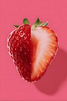 Een aardbei zweeft tegen een monochrome roze achtergrond, precies in tweeën gesneden: links de glanzende, onberispelijke schil met zaadjes, rechts de opengesneden, sappige binnenkant. Het sterke contrast tussen het oppervlak en de binnenkant wordt benadrukt door lichtreflecties. De compositie is minimalistisch, bijna klinisch…