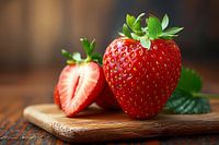 Op zoek naar een perfecte zomerse foto? Deze close-up van een aardbei op een snijplank is pure schoonheid in eenvoud. Perfect voor aan de muur in je keuken of eetkamer.