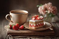 Sfeervolle foto van koffie en aardbeientaart met slagroom. Perfect voor landelijke keukens, eetkamers of een knusse koffiehoek. Warm en uitnodigend.