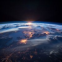 Unieke Aarde in het donker schilderij met een originele stijl. Met prachtige kleurtinten en een uniek ontwerp maakt dit tot een stijlvolle fotoprint die prachtig staat in elke ruimte.