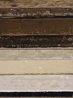 Horizontale kleurvlakken - van diepbruin en zwart tot zacht beige en crème - creëren een tactiel landschap van contrasten.