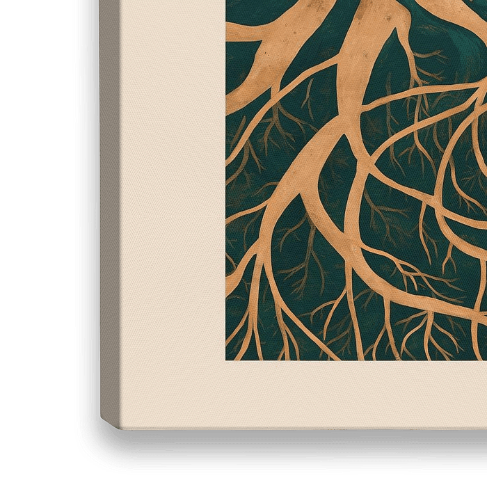Het woord is uitgespreid over de poster, verstrengeld als wortels in een bos. Het algehele ontwerp is visueel opvallend, met een gevoel van diepte en dimensie.