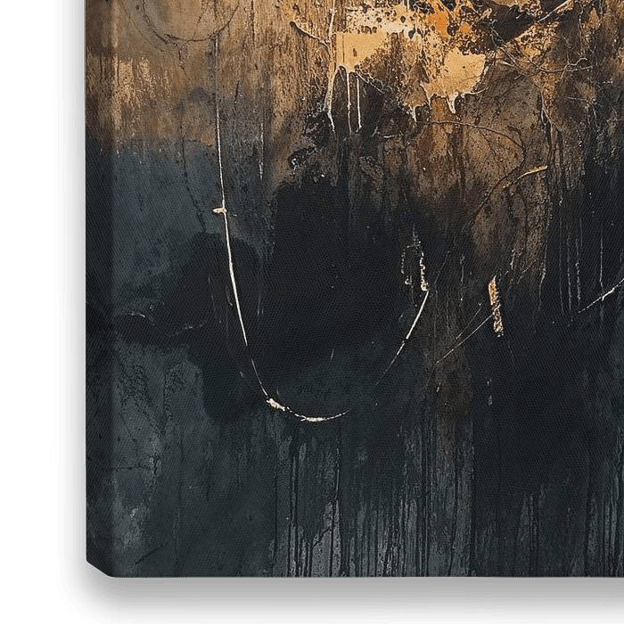 Aardetinten Abstract - Het schilderij onthult een harmonieus spel van abstracte vormen waarin warme gouden en aardetinten overheersen, gecomplementeerd door zones van koel blauw en zwart onderaan. De textuur en de krachtige uitstrijkels suggereren een dynamische en emotionele expressie en bieden een rijk visueel landschap dat in menig…