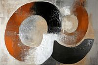 Aardetinten | Monochrome Orbit - Dit abstracte schilderij toont een compositie van grote, overlappende cirkels en halve cirkels in aardetinten en zwarte en witte contrasterende vlakken, onderbroken door een patroon dat lijkt op gebarsten glas.