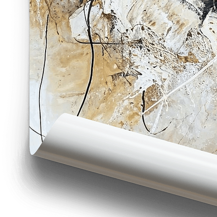 Aardetinten - Een dynamisch abstract werk dat een harmonieuze chaos uitstraalt door een spel van texturen en lagen. De dominante aardetinten, punctuated door vleugen goud, creëren een rijk palet dat warmte en diepte verleent aan elke ruimte. Het gebruik van zwart voegt drama toe en leidt het oog.