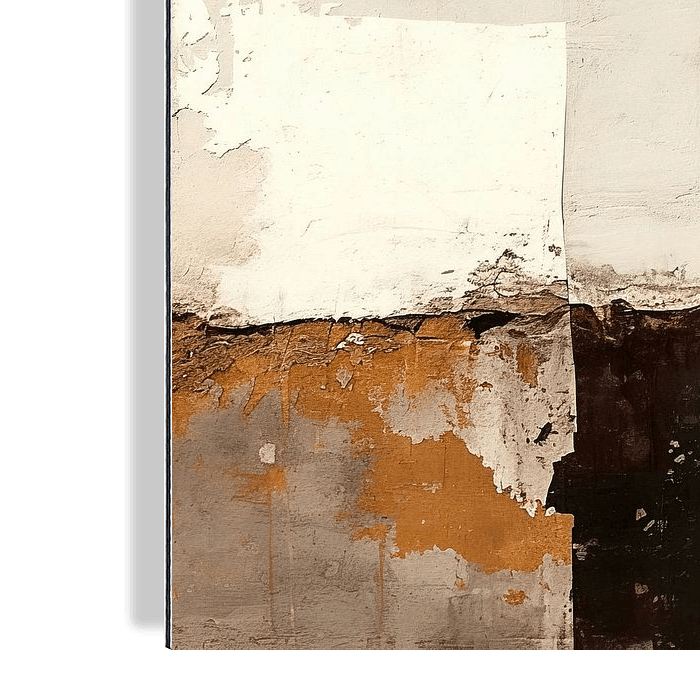 Aardetinten - Op dit abstract schilderij zie je een combinatie van aardetinten en neutrale kleuren, met duidelijk zichtbare structuren en lijnen die de verschillende delen van het schilderij afbakenen.