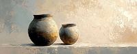 Aardewerk | Earthy Essence Unveiled - Dit stilleven schilderij toont twee rustieke, glanzende aardewerken potten op een weerkaatst oppervlak, met een textuurrijke achtergrond in gedempte aardtinten, die de aardewerken potten centraal zet.